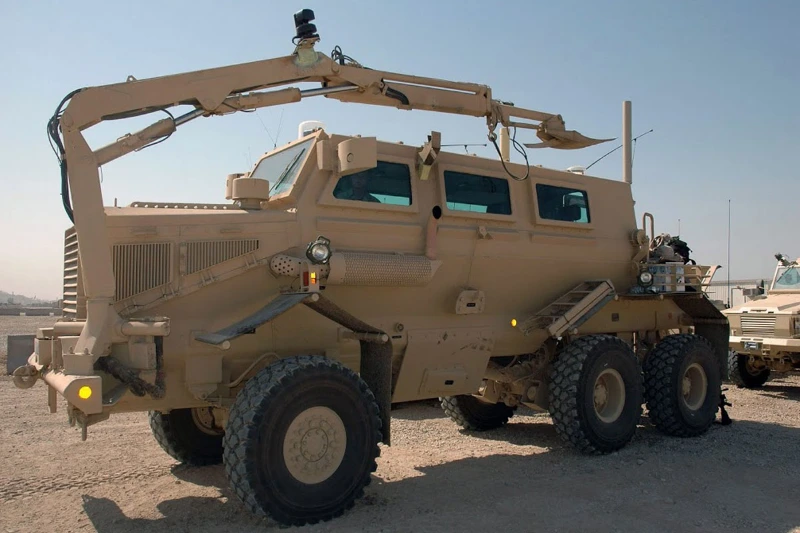 The 27-foot-long, 76,000-pound Buffalo Clearance Vehicle is one of the most valuable vehicles in the vault. It's classified as a Mine Protected Route Clearance Vehicle (MPCV) with a speed of 55 miles per hour. It has a 30-foot-extending robotic arm equipped with cameras and sensors to avoid dangerous routes.